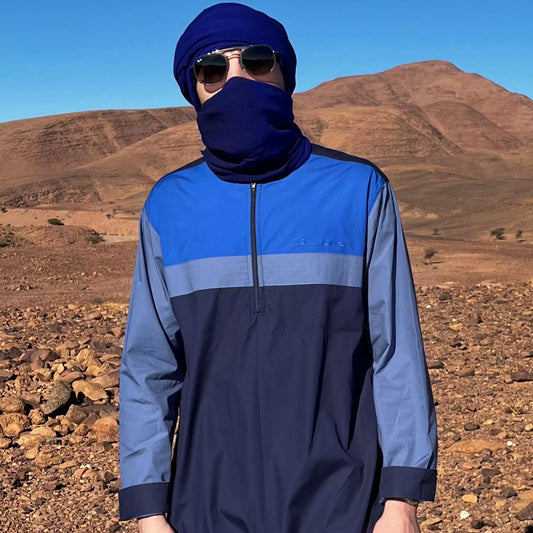 Notre Qamis "Bleu Touareg" d'un magnifique bleu nuit, et d'un bleu Touareg, intense et profond, sur la poitrine, rappelle les tenues traditionnelles des peuples nomades du désert, ajoutant une dimension culturelle et authentique à ce vêtement.